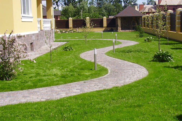 Не забывайте про пути подхода к дому и разным зонам. Для оформления можно выбрать разные материалы. Тропинки сооружают из щебня, асфальта, деревянных спилов, кирпичей, бетона, плитки так, чтобы их вид гармонировал с дизайном дома и местностью.